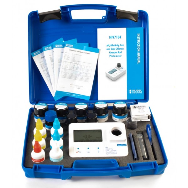 HI97101C se suministra con reactivo líquido para 100 test de Cloro Libre y 100 test de pH, cubetas (2), tapas de cubeta (2), tapón de plástico (2), 1.5V pilas AA (3), kit de patrones de calibración certificados, paño limpieza para las cubetas, tijeras, certificado de calidad y manual de instrucciones en un robusto maletín de transporte.