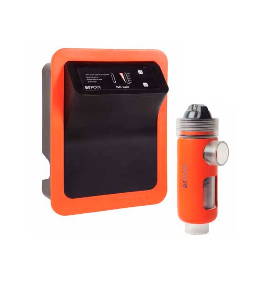 Clorador salino BS-Salt BSV. Clorador salino compacto en caja IP65 con una producción de 10 a 35 gramos destinado a piscinas privadas. Equipo con regulación de cloro manual, indicación de falta y exceso de sal, autolimpiable y con opción de añadir Kit Sonda Agua.
