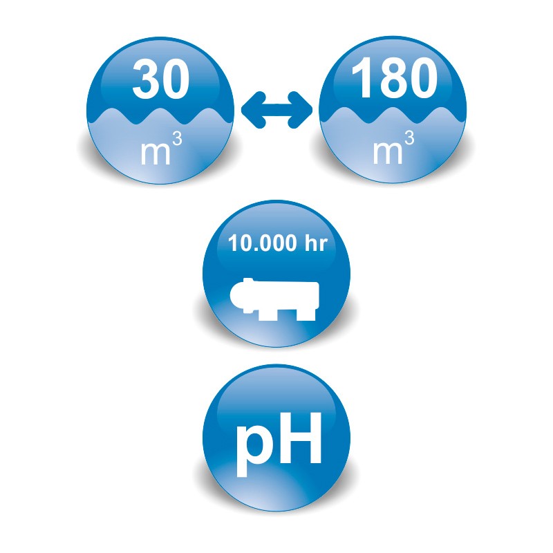 - Versiones disponibles con control de pH integrado. La versión pH incluye panel de control específico con indicación de nivel de pH, bomba dosificadora peristáltica externa de 1,5 l/h (1,5 bar), sonda de pH y soluciones de calibración.