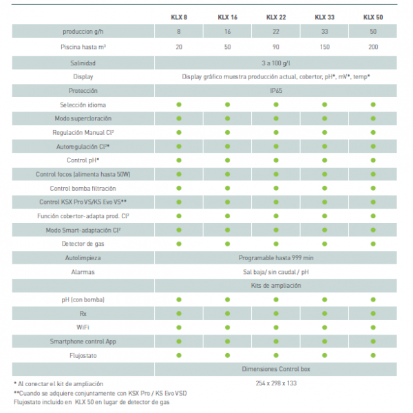 El Clorador Salino Piscina KLX de Kripsol genera cloro de manera natural a partir de la sal, por lo que es respetuoso con el medio ambiente y no produce efectos secundarios perjudiciales. A diferencia de los productos químicos convencionales, esta innovadora tecnología de Kripsol garantiza que tu piscina estará siempre limpia y segura sin dañar tu salud o la de los tuyos. Además, este sistema es completamente automático, lo que te ahorrará tiempo y esfuerzo en el mantenimiento de tu piscina.