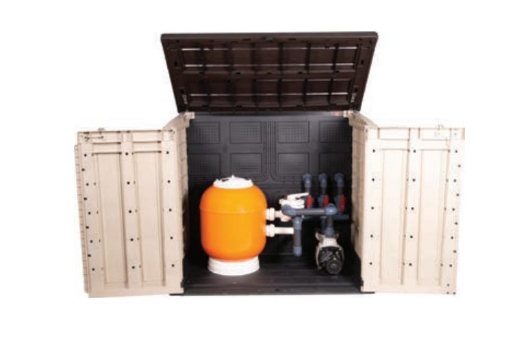 Caseta fabricada en resina de máxima calidad, totalmente resistente a los cambios de temperatura y a los rayos UV, que incluyen filtro, bomba, clorador salino válvula selectora, manómetro y cuatro válvulas de bola para: skimmer, fondo, limpiafondos, desagüe respectivamente. Velocidad filtración: 50 m³/h/m².