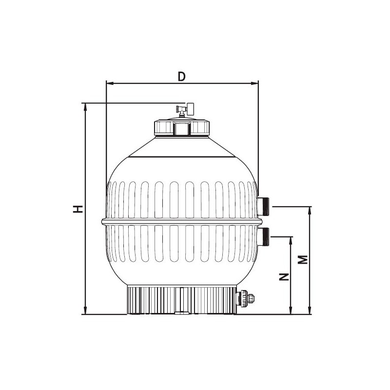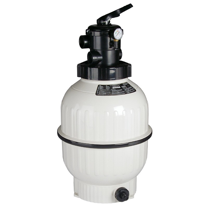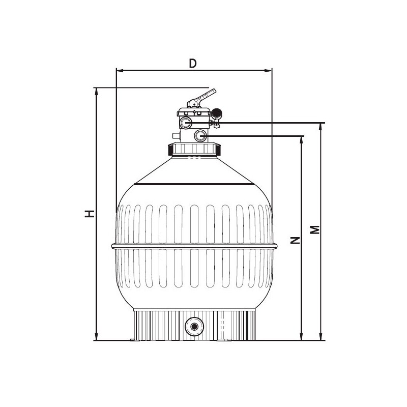 - Filtro de arena con salida superior (top). También disponible con salida lateral según conveniencia y espacio disponible para su ubicación. Si el espacio no es un problema en la instalación, Poolaria recomienda optar por la versión lateral (ver productos relacionados) ya que facilita las tareas de mantenimiento, sustitución del medio filtrante, etc.