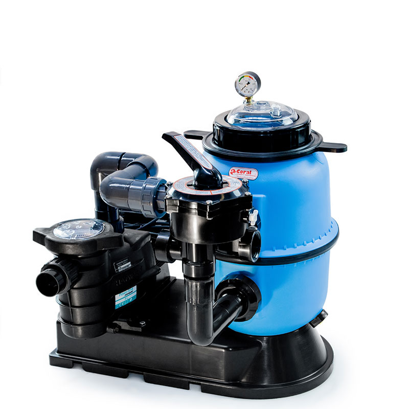 Filtro inyectado en plástico color azul, montado sobre bancada rectangular (MONOBLOCK) en plástico (300/400) Fibra de vidrio (500/600) tapa transparente, cierre roscado mediante tuerca.