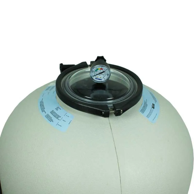 El manómetro integrado permite leer en todo momento la presión de trabajo e identificar cuándo el lecho de arena está colmatado y necesita lavado. La purga de agua manual facilita la eliminación de aire del circuito y el vaciado controlado del filtro.