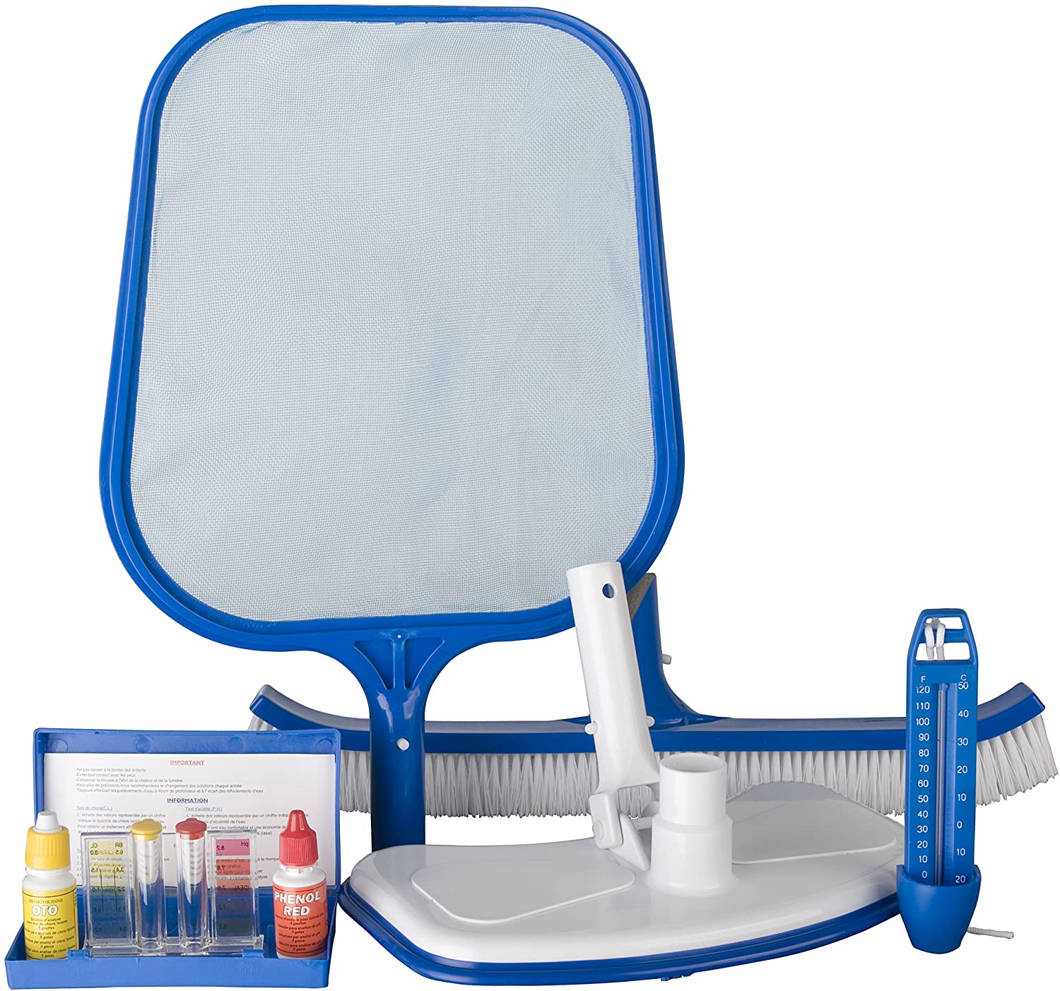 - El kit incluye: analizador de Cloro y pH, cepillo de 45 cm que ayuda a eliminar las incrustaciones y algas de la piscina, recogehojas que permite limpiar la suciedad acumulada en la superficie, termómetro flotante para conocer la temperatura del agua y cabezal limpiafondos ovalado que permite aspirar la suciedad del fondo de la piscina