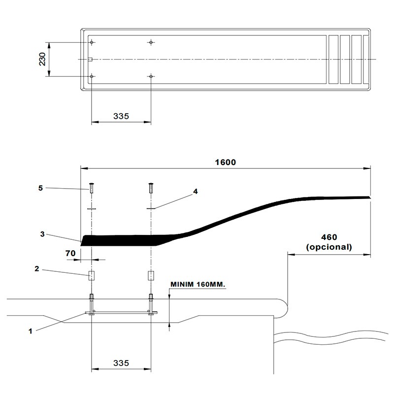 - Realizar fundaciones de hormigón para empotrar el anclaje suministrado conjuntamente con el trampolín (grosor mínimo de 160 mm). La longitud de varilla que ha de sobresalir del hormigón para la fijación de las ballestas viene determinada por unos tapones, que al mismo tiempo sirven para proteger la rosca en las operaciones de rellenado de hormigón.