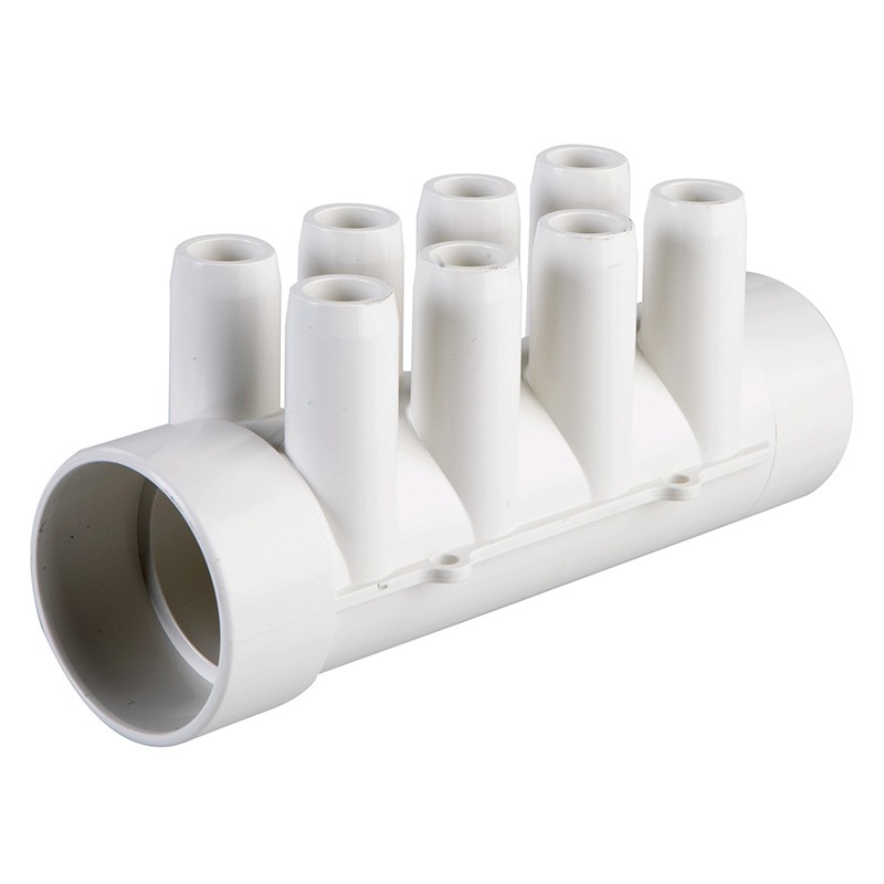 - Colector de agua para encolar a tubo de 50 mm con 8 salidas para embridar a manguera de diámetro interior 20 mm.