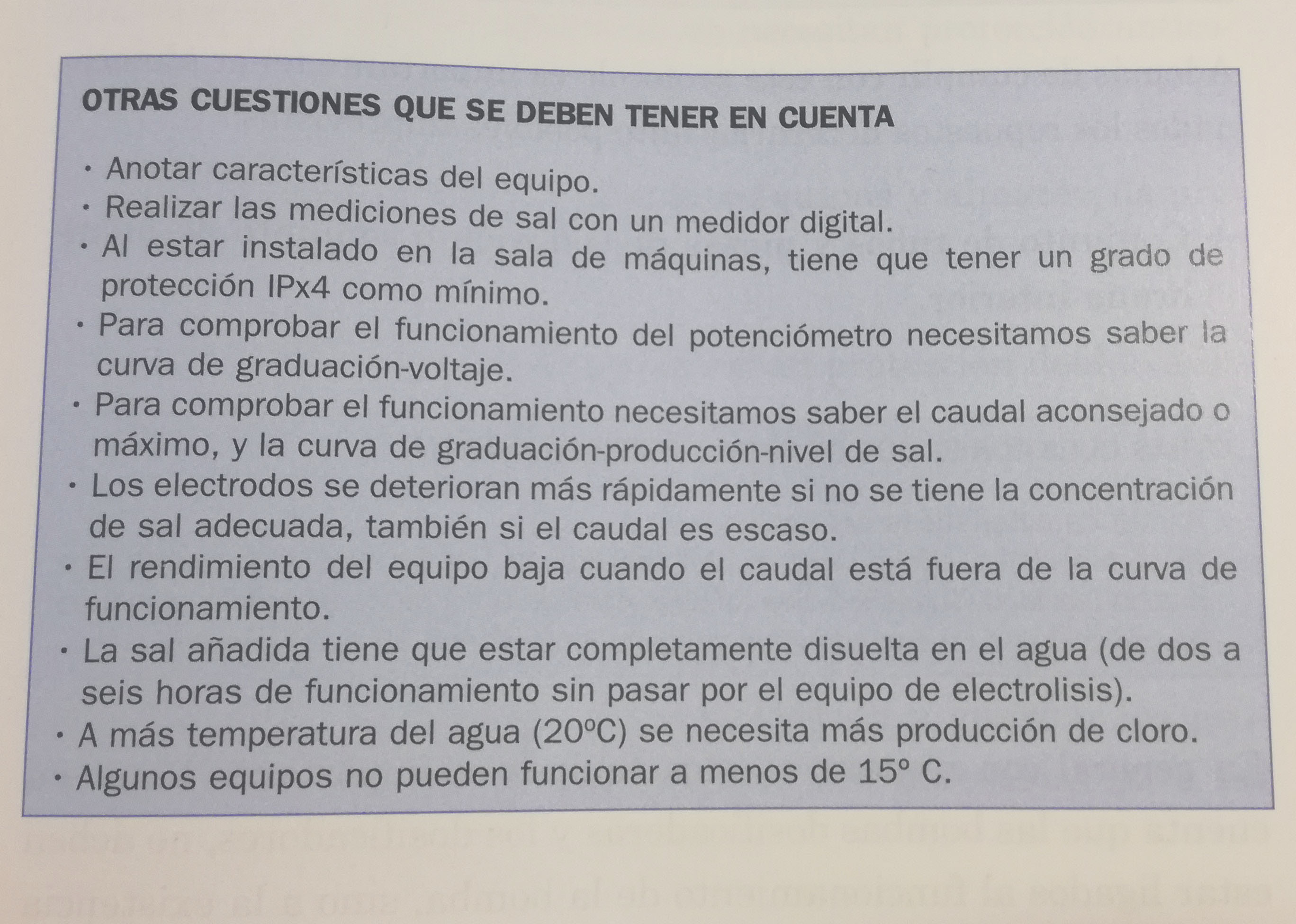 El cálculo de la producción de cloro del equipo va a depender de los m³ de agua de la piscina, del máximo aforo diario y de otros posibles contaminantes, como hojas, etc. A este cálculo se le añade entre un 15% y un 30% más de posible producción. El potenciómetro gradúa el voltaje existente entre los dos electrodos: a más potencial más producción (teórica) de cloro.