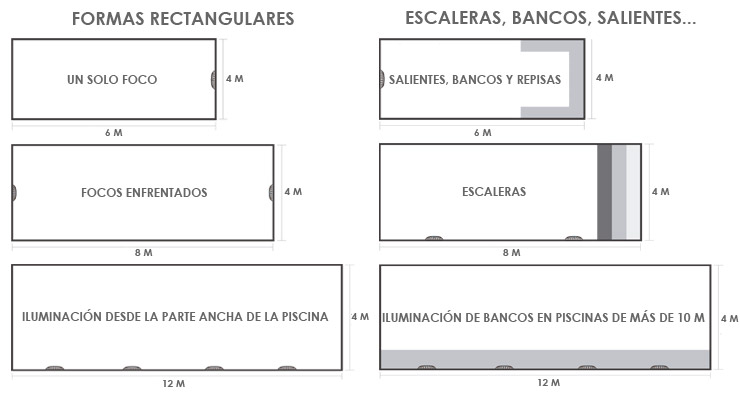 Aunque el diseño de cada piscina es diferente, los principios básicos de diseño suelen ser los mismos. Estos criterios clave para el diseño de iluminación están ilustrados a continuación para que puedas disponer de una información muy completa de cara a lograr la iluminación perfecta para cualquier tipo de piscina.