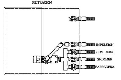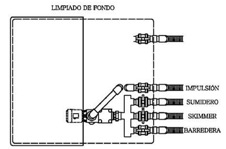 Como hemos comentado en el apartado anterior, su piscina tiene varias tomas o boquillas, que corresponden con el mismo número de tuberías y por consiguiente con otras tantas válvulas, llamadas coloquialmente llaves. Así tenemos llave de skimmer, llave de fondo, llave de barredera y llave de desagüe. De la posición de la válvula selectora, y de la posición de las llaves depende la función que va a efectuar la depuradora. La maneta de la llave paralela a la tubería significa que esta se encuentra abierta; perpendicular a la tubería que esta se encuentra cerrada. Así las posiciones de la válvula selectora y de las llaves quedarán como a continuación describimos: