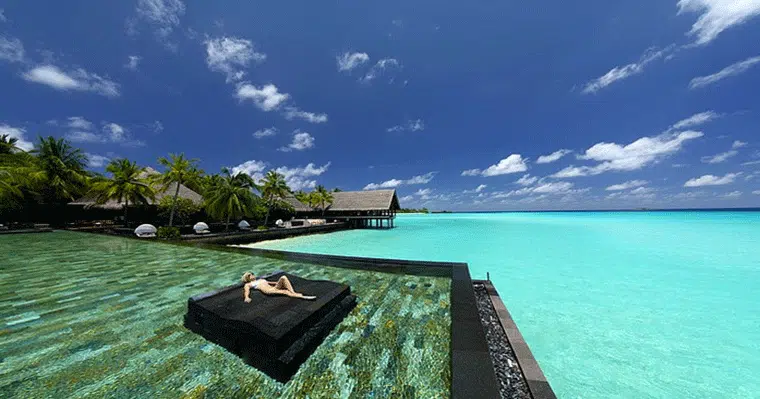 El paraíso debe de parecerse al hotel One & Only Reethi Rah. Lujo, privacidad y exclusividad rodeados de la exuberante naturaleza de las Maldivas y las maravillosas aguas cristalinas del Océano Índico. Consta de 130 villas privadas separadas entre sí y de un spa insular con piscinas de hidromasaje, salas de vapor, sauna, fuentes de hielo estimulantes y duchas regulables. Además su piscina no te dejará indiferente: ni más ni menos que una piscina más pequeña dentro de otra de mayor tamaño que terminan fusionándose con el Océano Índico. [space ]