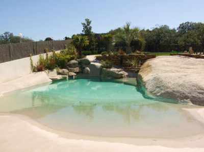 Pros: Este tipo de material es bastante realista y da sensación real de playa. Existen varios tipos de arenas y piedras.