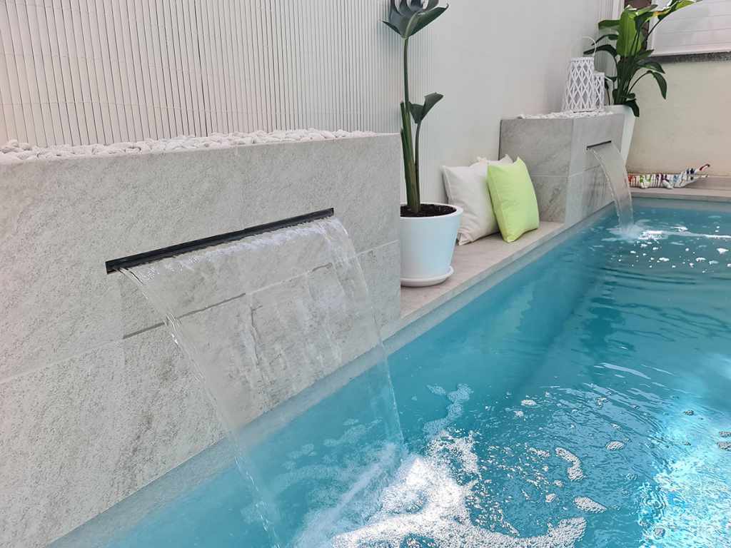 Cuando hacemos referencia a cascadas, no necesariamente hablamos de los típicos chorros de spa o cascadas de acero. Hoy día, suelen integrarse por completo en la piscina para aportar cierta estética moderna al proyecto.